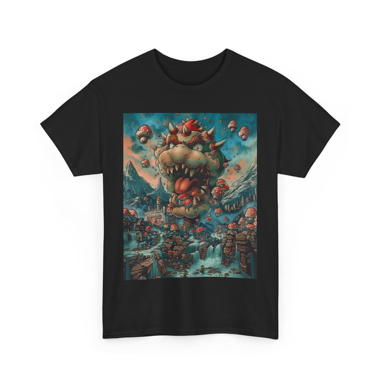 - Bold Design: Showcasing a vibrant and whimsical print of the Lizard king and his formidable kingdom, this shirt brings the world of Mario to life in a new re-imagined way. The high-definition graphics are eye-catching and add a dynamic touch to your outfit.