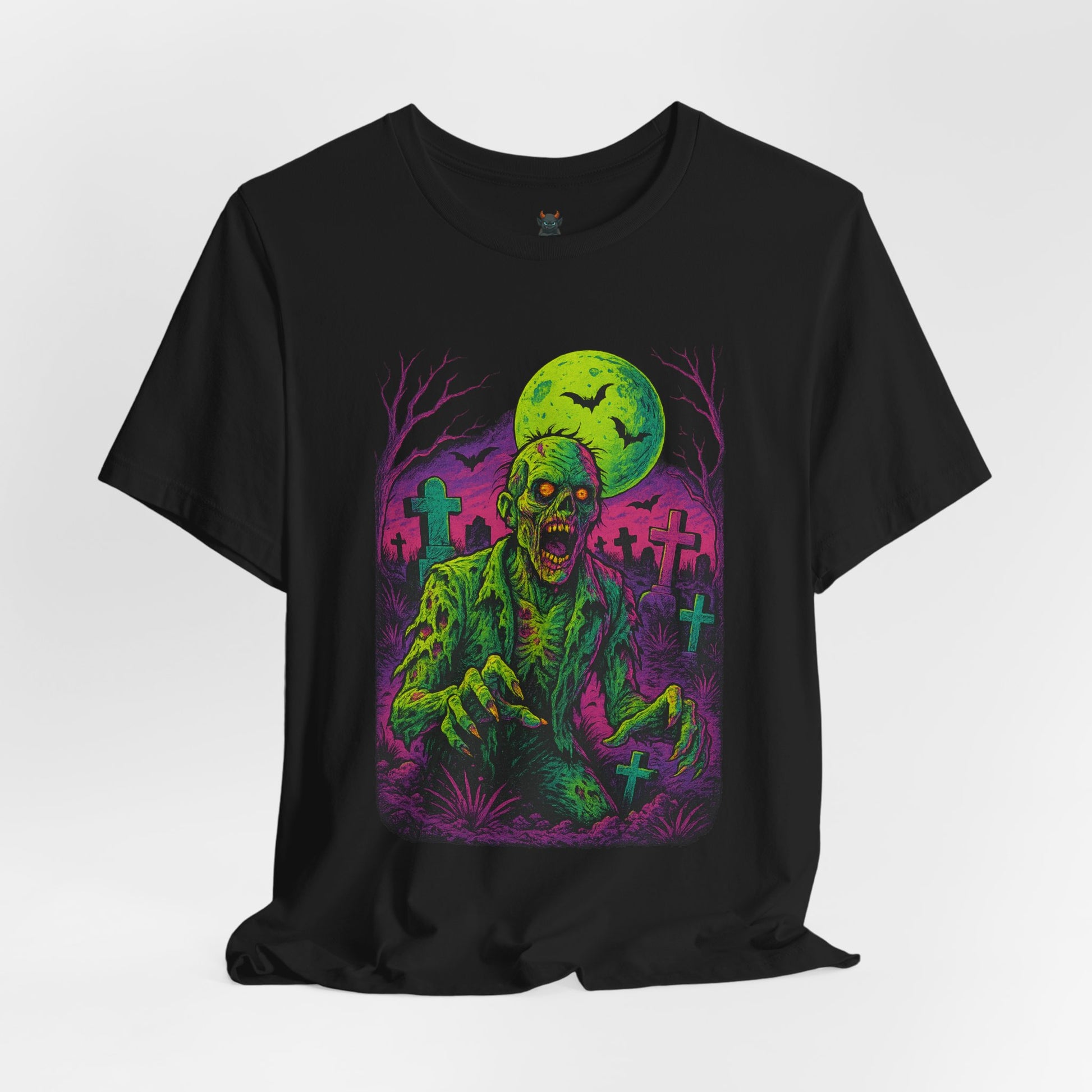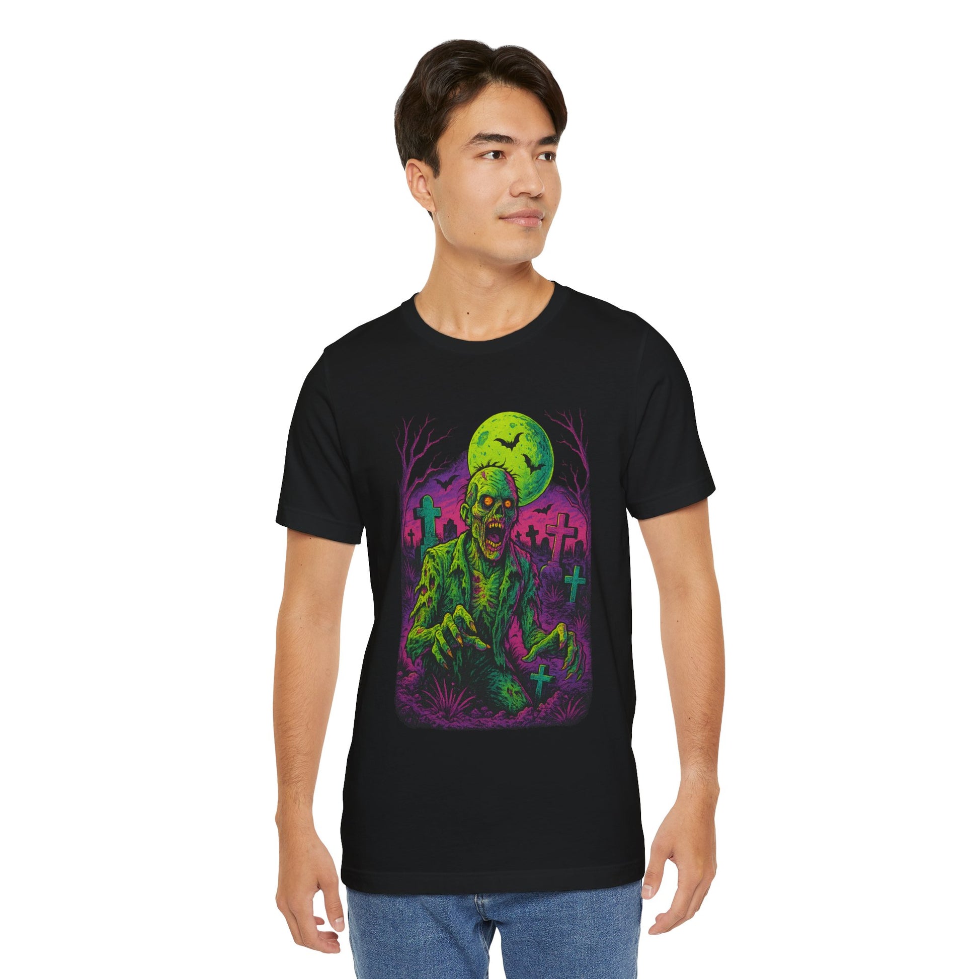 Bring your wardrobe back from the dead with this electrifying neon-horror graphic tee. Designed in a bold retro-comic style, this shirt features a radioactive zombie clawing up from a graveyard under a glowing moon — the kind of artwork that practically jumps off the fabric.