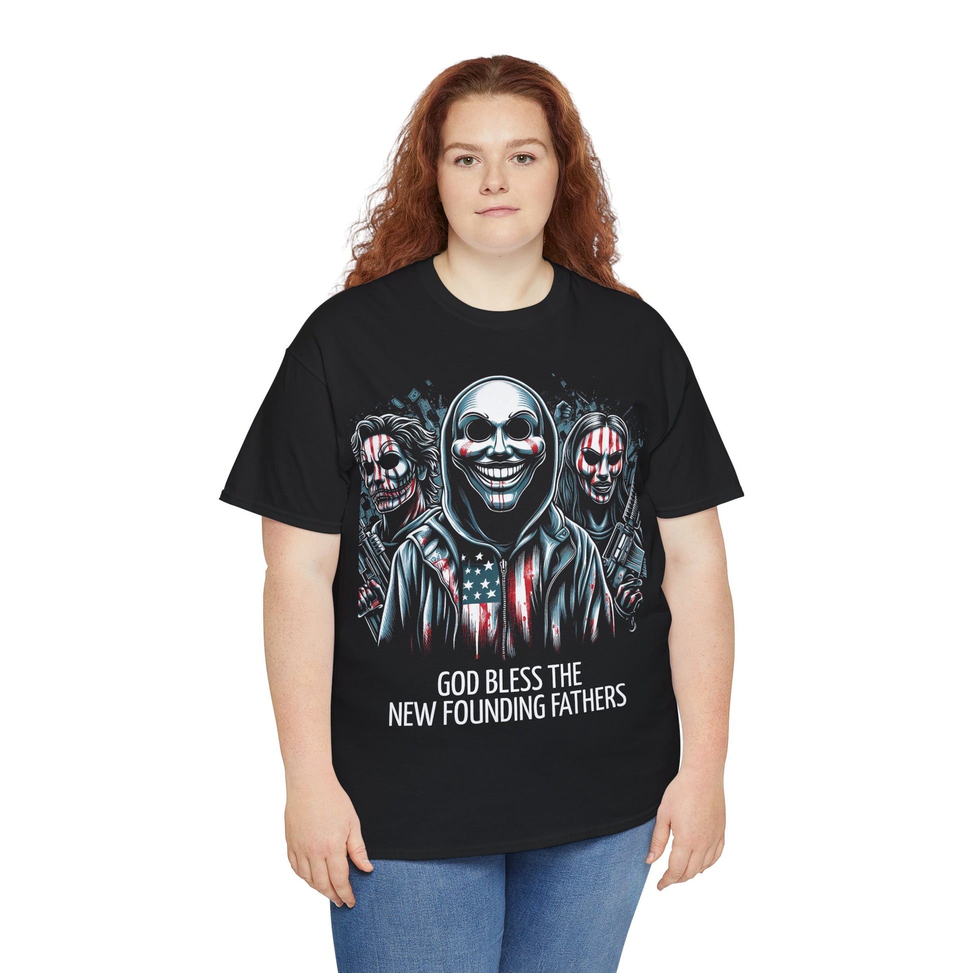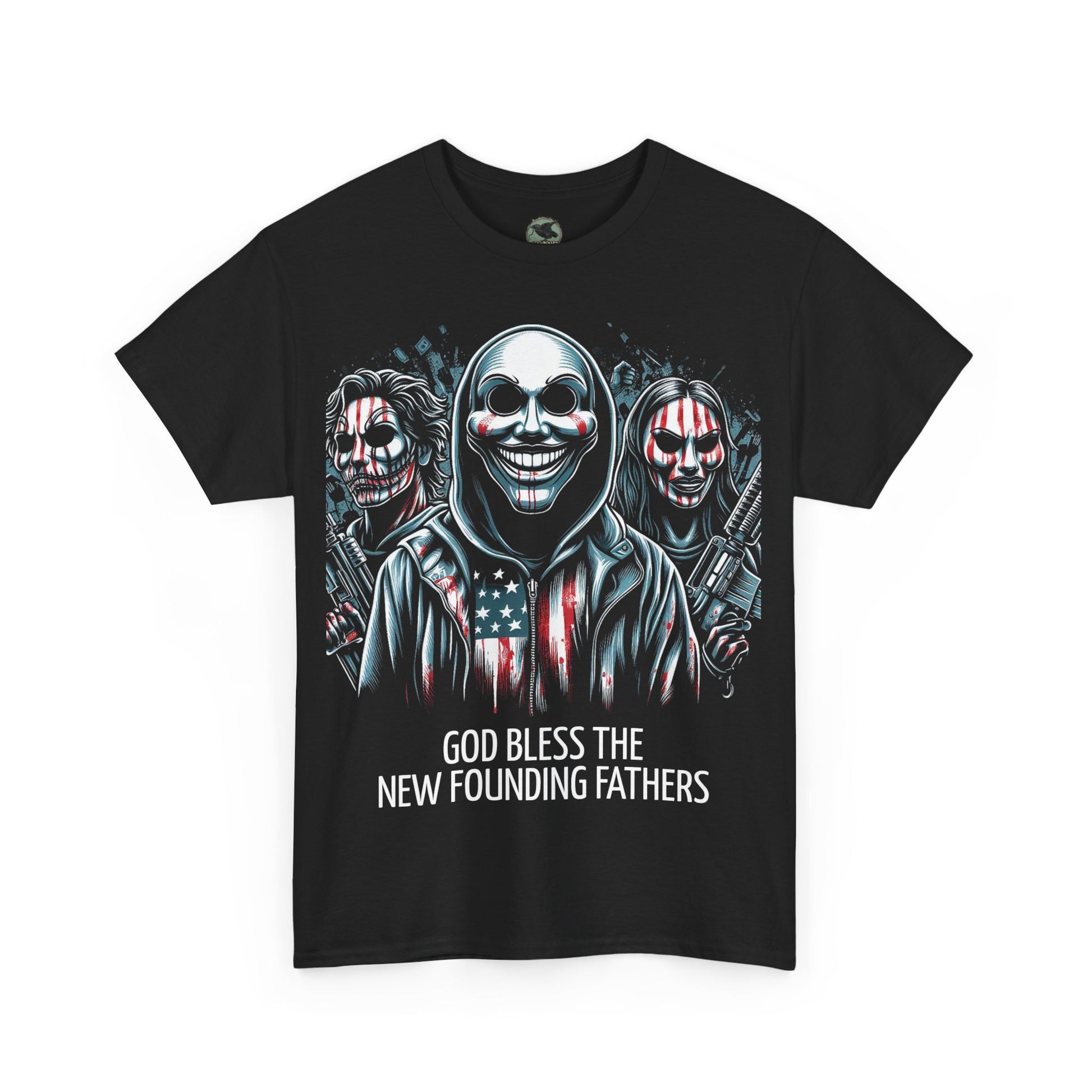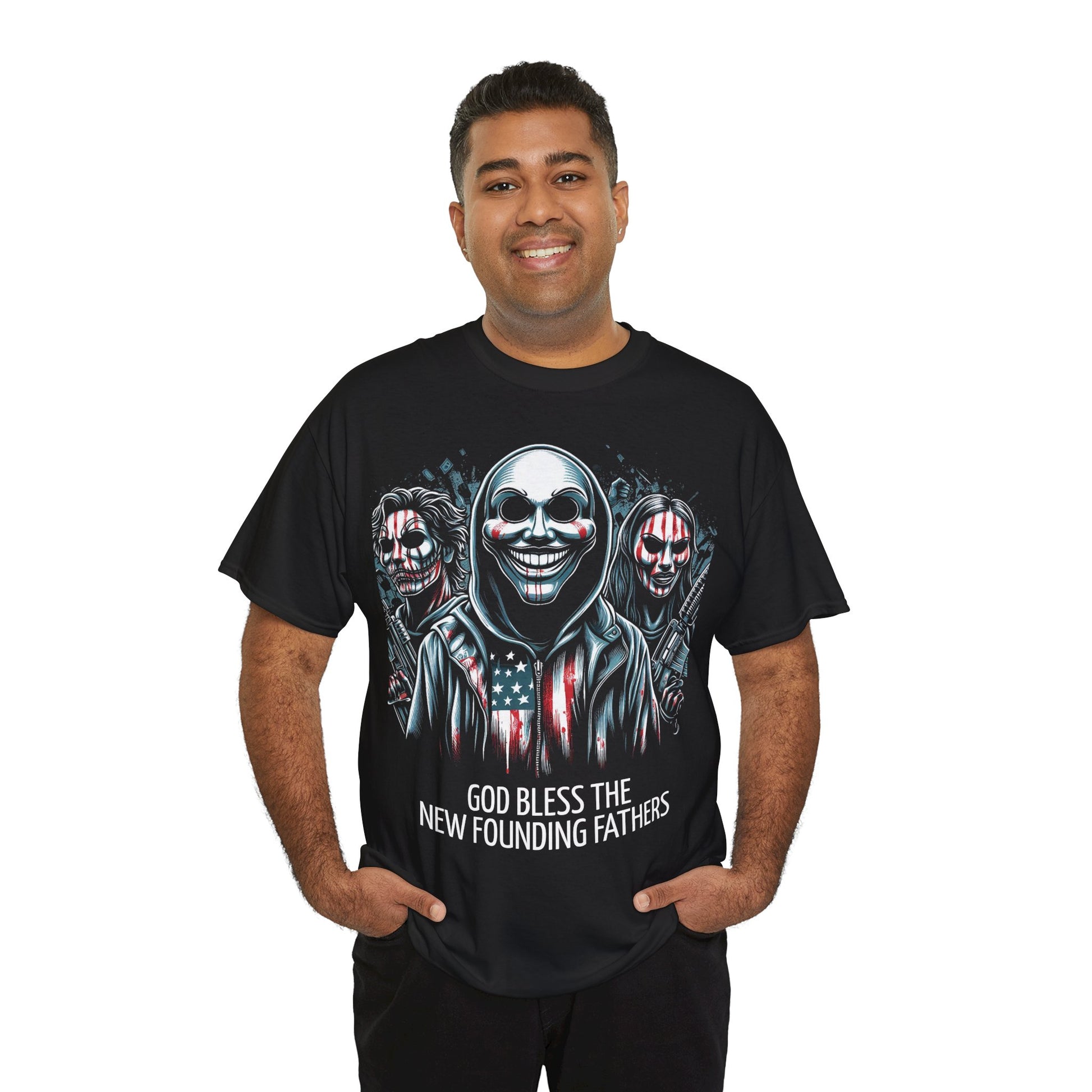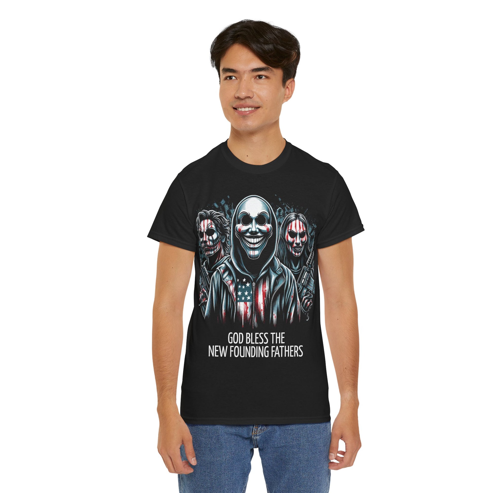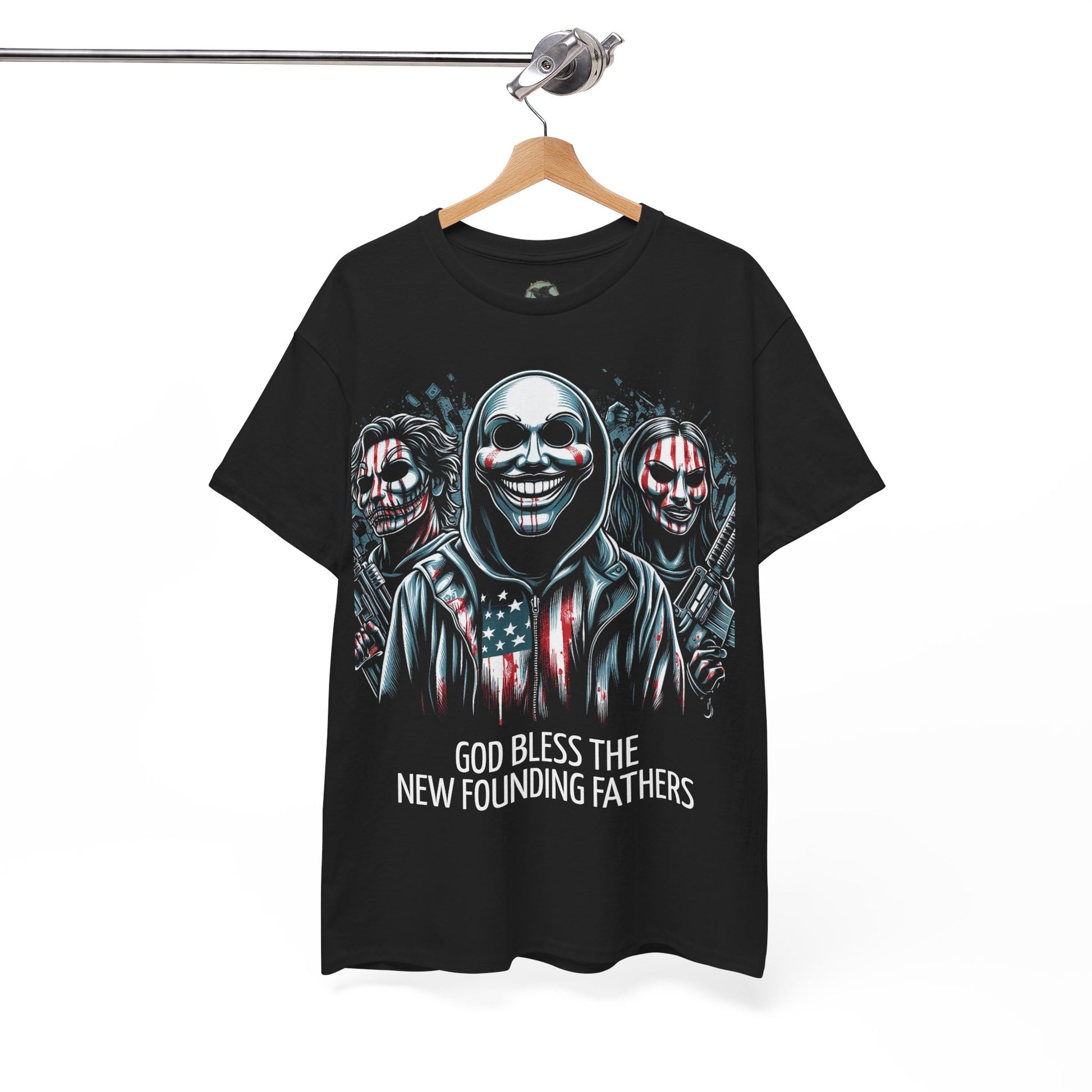 Embrace the chilling world of The Purge with our "The New Founding Fathers" Tee Shirt. This striking design pays homage to the dystopian thriller that captivated audiences with its intense portrayal of an annual night of chaos. Perfect for fans of the franchise, this tee brings the eerie essence of the film right into your wardrobe.